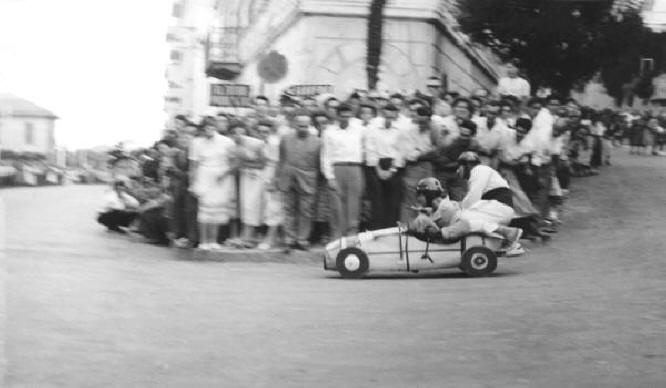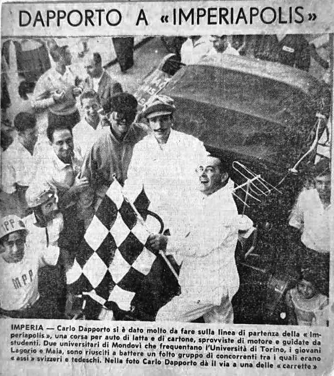 Carlo Dapporto al via si e' dato molto da fare sulla linea di partenza della "ImperiaPolis", una corsa per auto di latta e di cartone, sprovviste di motore e guidate da studenti. Tra i concorrenti, Piemontesi, Svizzeri e Tedeschi..