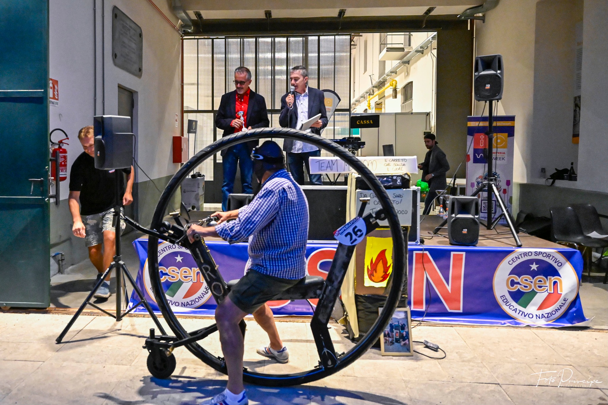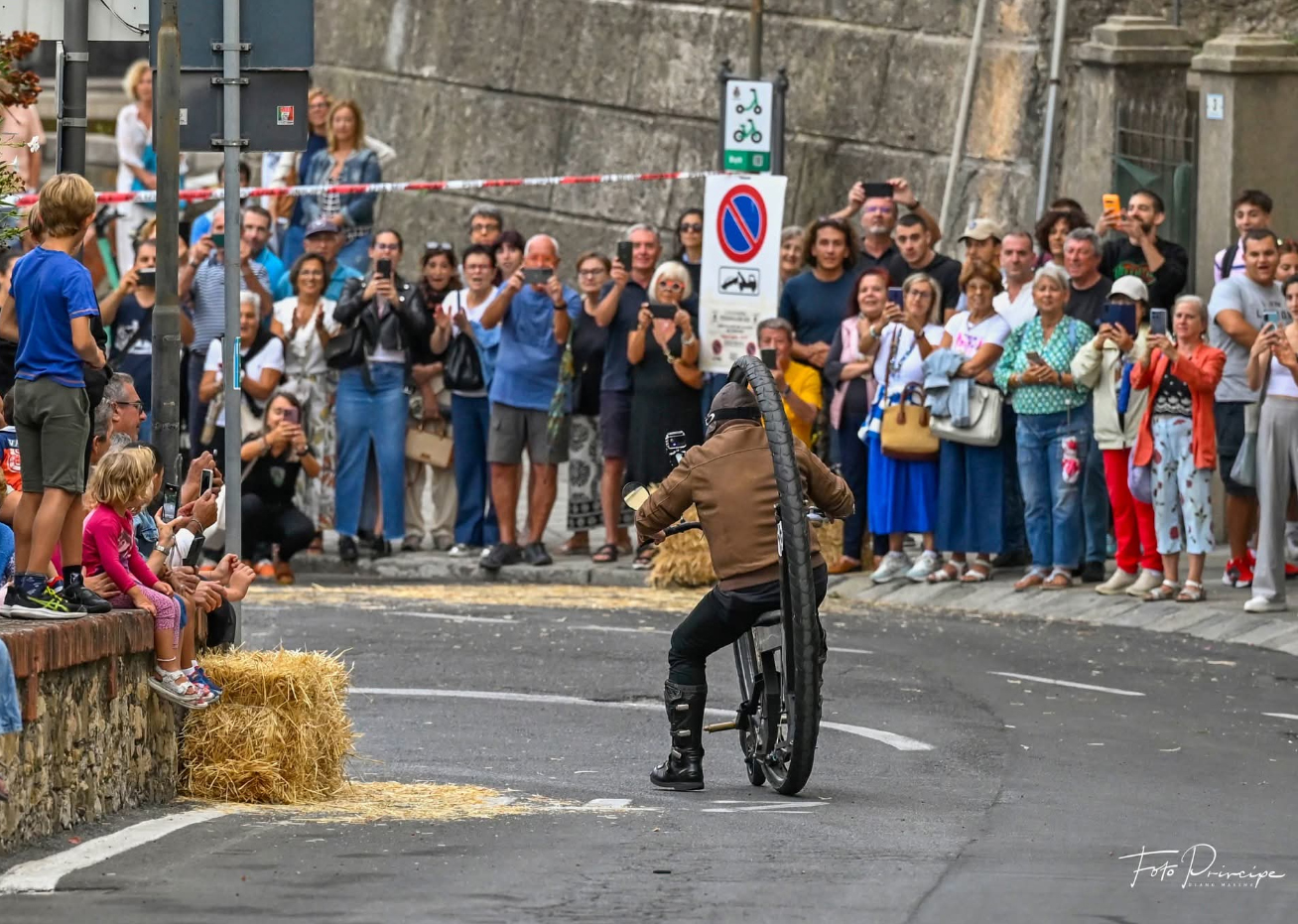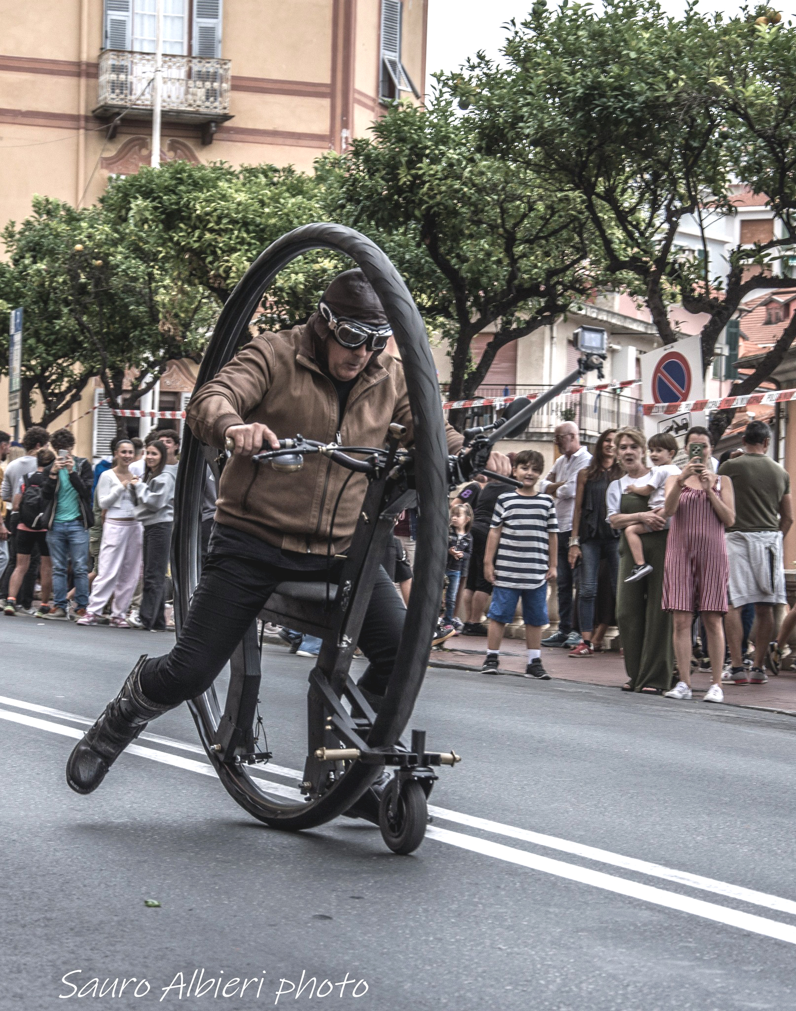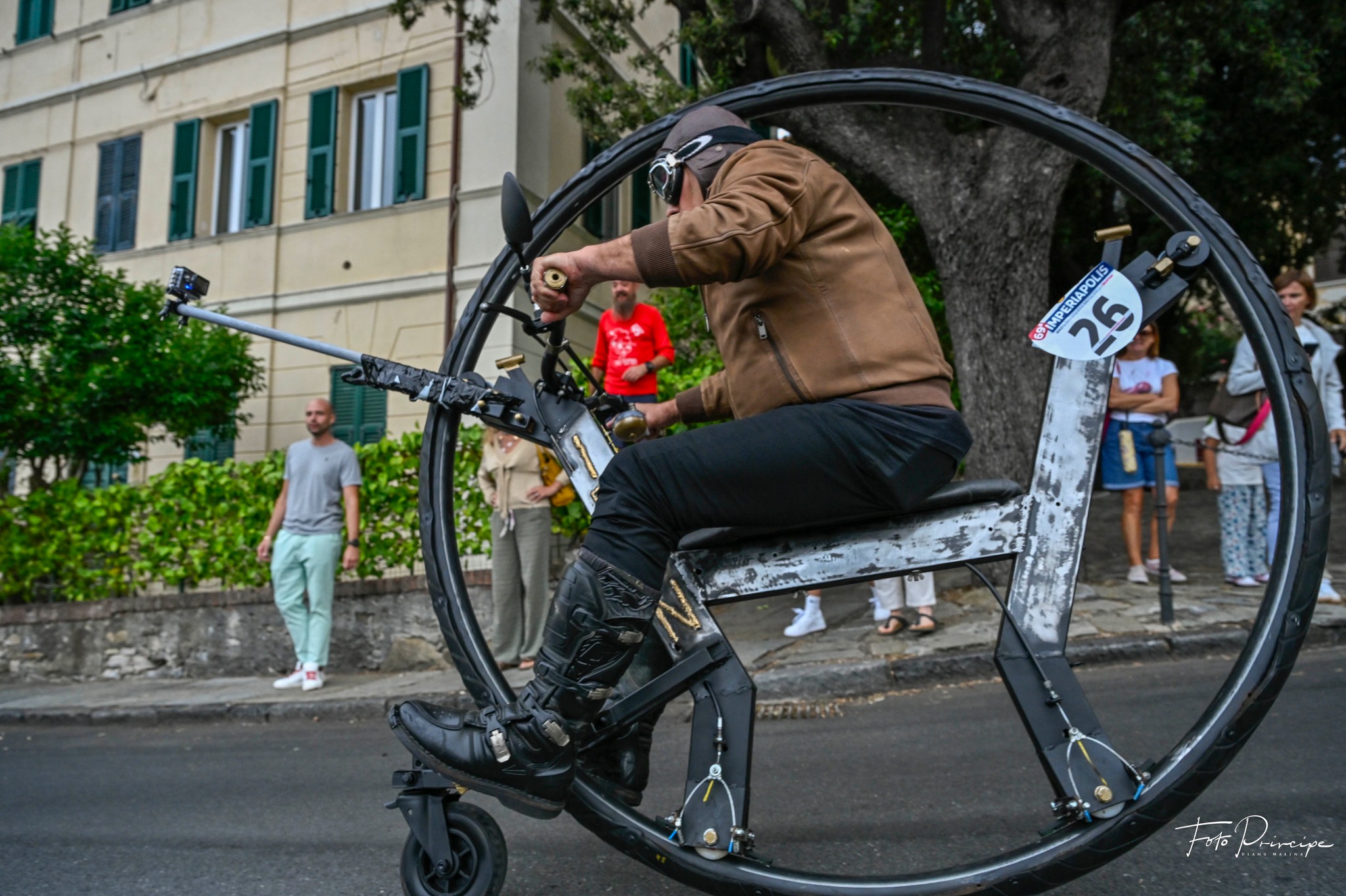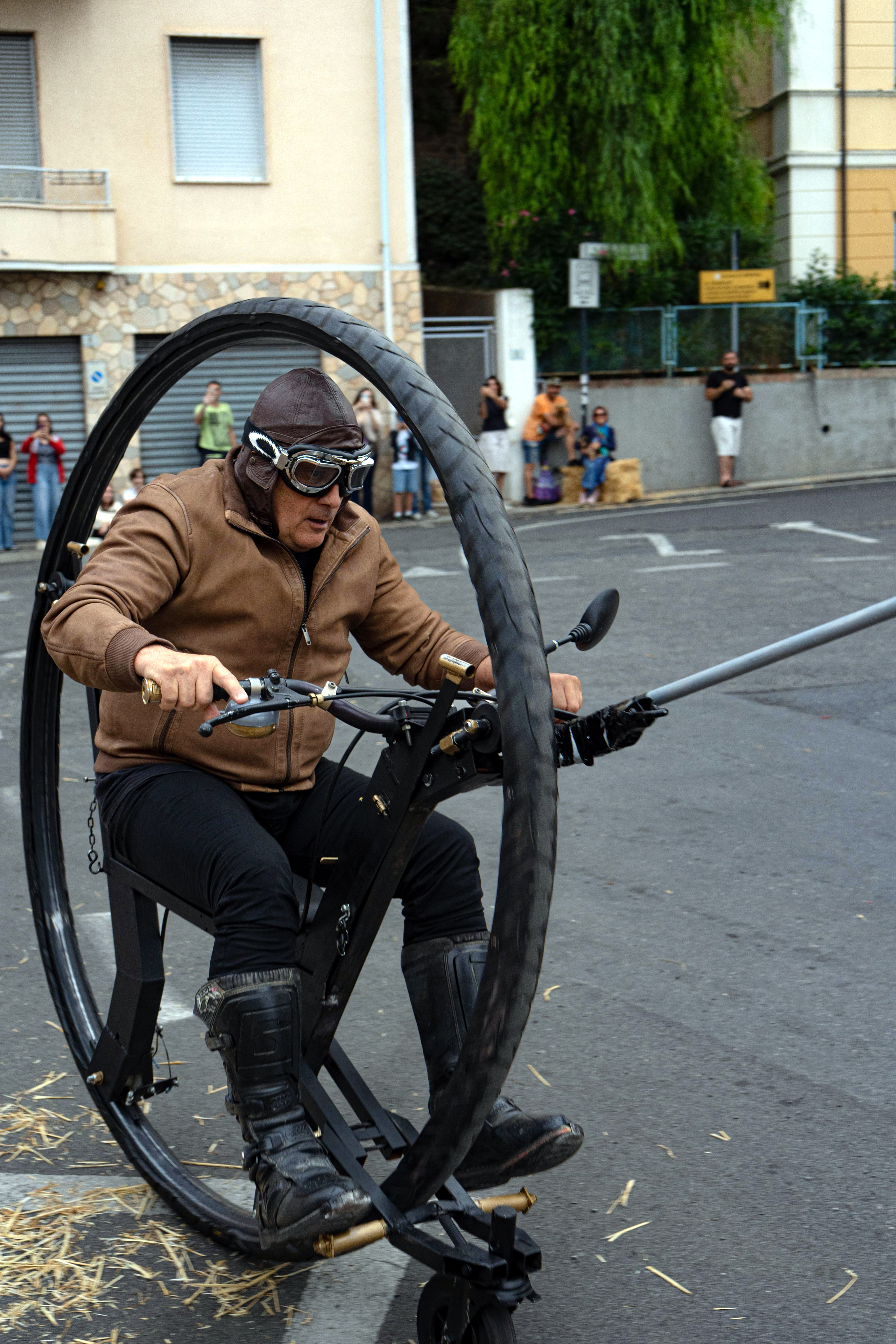 l'inventore che guida la moto-ruota ne dimostra le doti di leggerezza e maneggevolezza. Archivio Storico Luce http://www.archivioluce.com